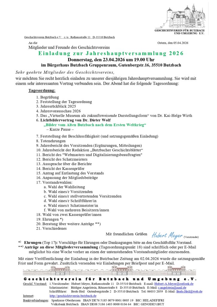 Einladung zur JHV am 23.04 um 19.00 Uhr im Bürgerhaus Butzbach, weiteres siehe unten.